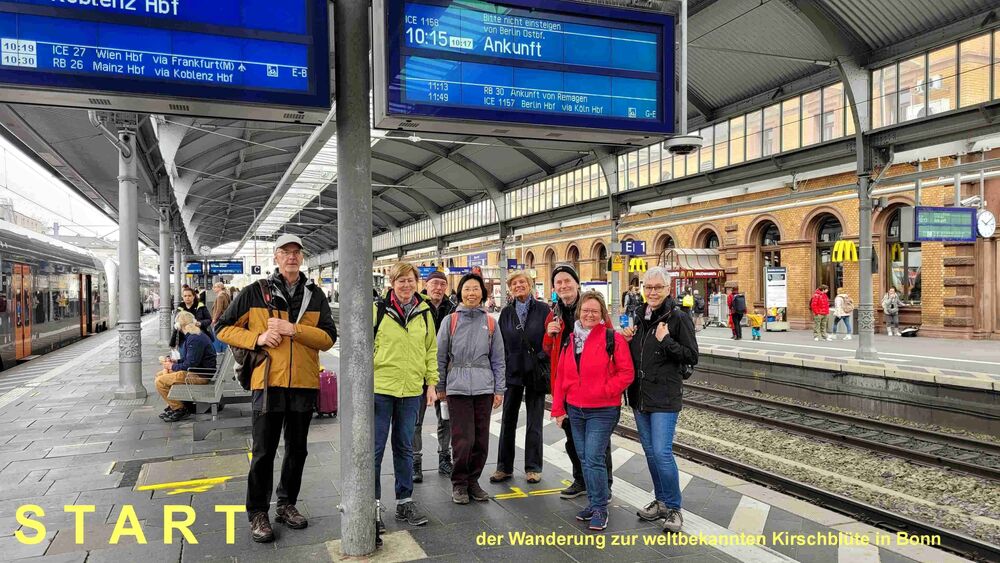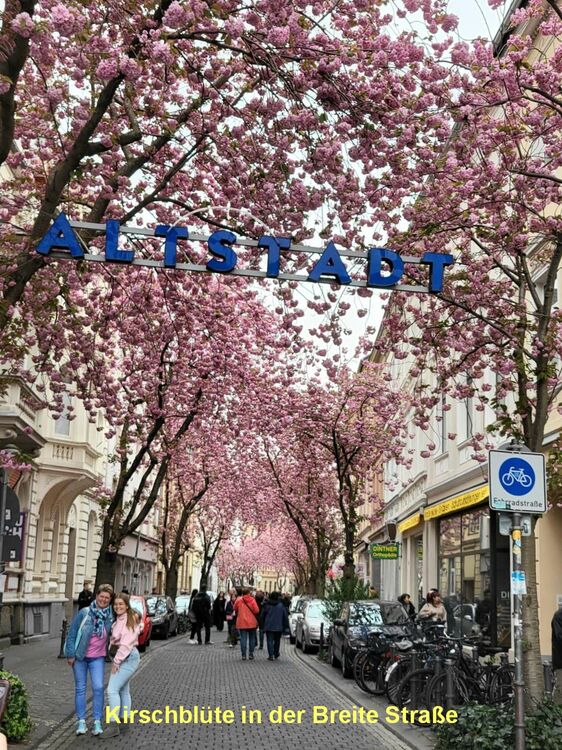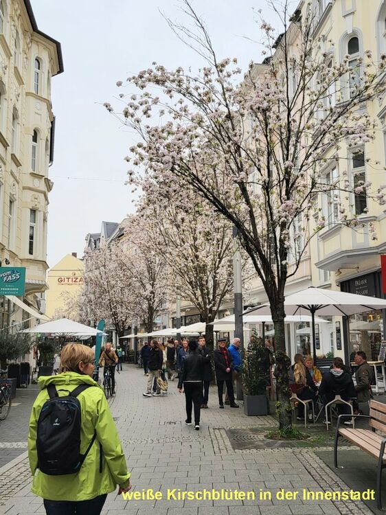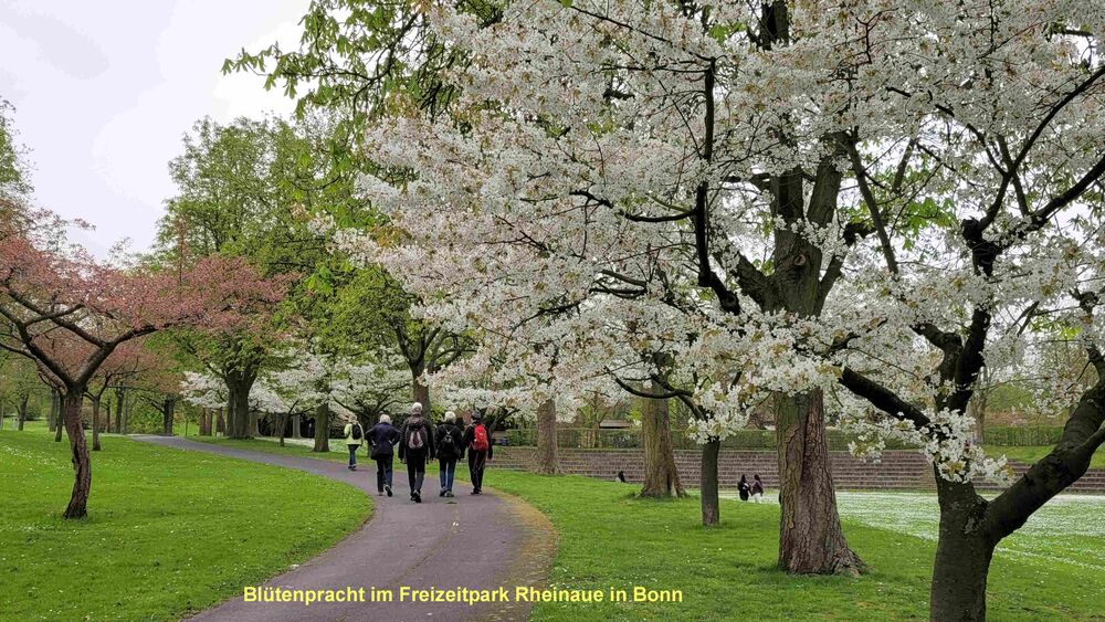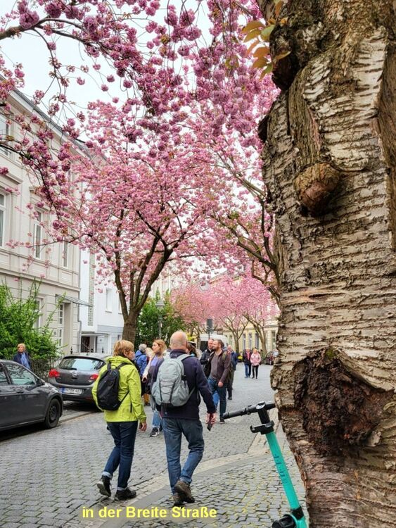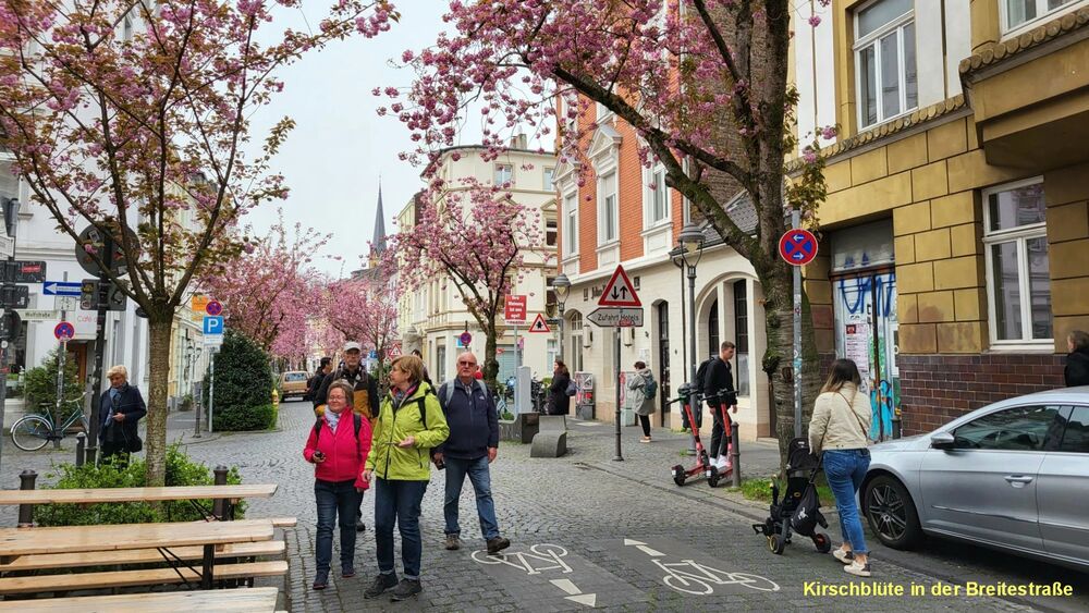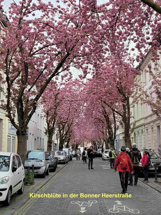 Der Frühling in Bonn grüßte unsere Wandergruppe (9) mit rosaroten Kirschblüten in der Heer- und Breite-Straße. Die teils uralten Kirschbäume waren frühzeitig erblüht und so konnten wir die Farben voll genießen, bevor der große Ansturm am Mittag begann. Wir hatten Zeit, schon zu morgendlichen Stunde ein Eiscafe aufzusuchen. Dann ging es weiter durch die Innenstadt, am Beethoven-Haus vorbei und über die Rheinpromenade in den Freizeitpark Rheinaue. Hier Besuch des Japanischen Garten. Am Post-Tower unterbrachen wir die Wanderung und fuhren mit dem Bus zum Hbf. zurück. Von hier aus wanderten wir über die Prachtstraße Poppelsdorfer Allee zum Schloss und zur Schlusseinkehr in Restaurant Gesindehaus.