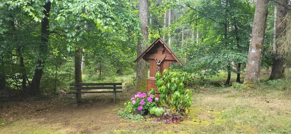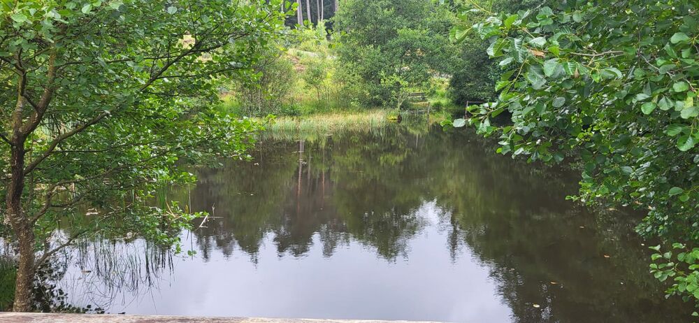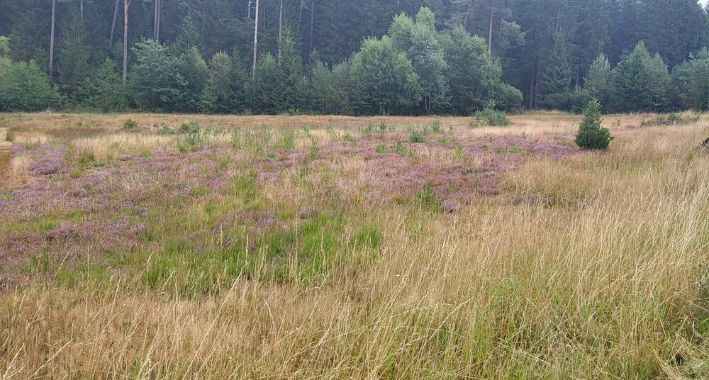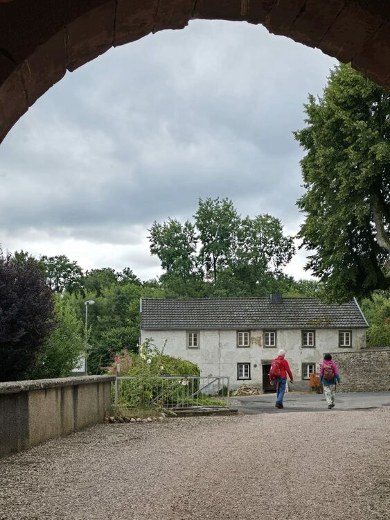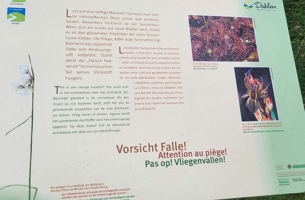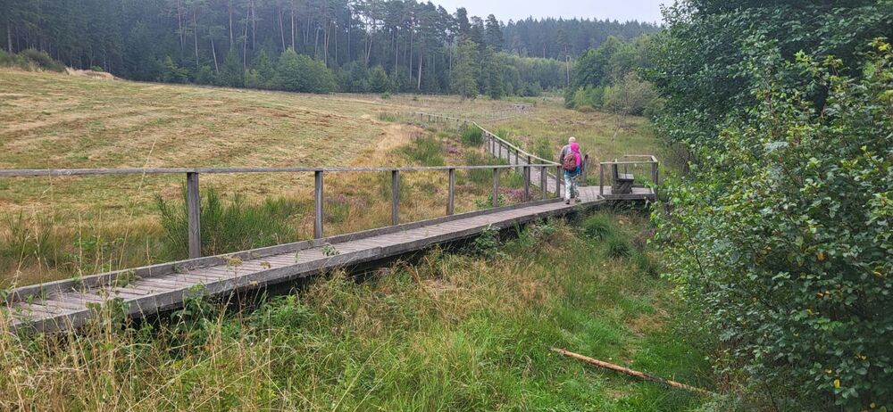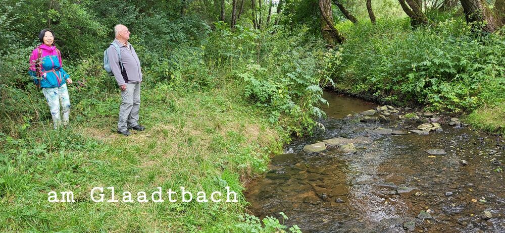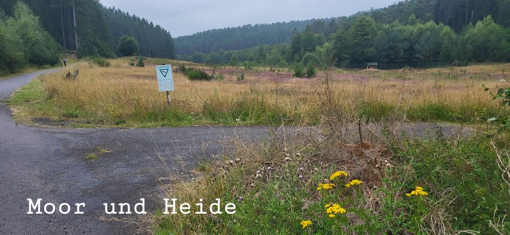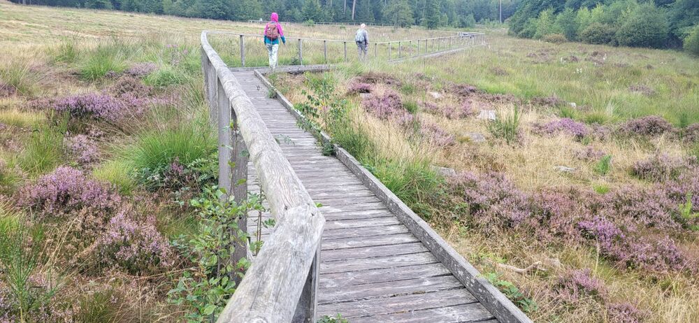 Unsere Wanderung zu Dritt auf dem Mühlen- und Moorpfad begann in Dahlem. Zunächst ging es durch das Glaadtbachtal und dann hinauf zum Rastplatz am Vierherrenstein an der Landesgrenze zu Rheinland-Pfalz. Dieser Stein zeigt die Gemarkungsgrenze von Esch, Schmidtheim, Dahlem und Jünkerath am Heidenkopf (547 m ü.NN) an. Weiter ins Heide- und Moorgebiet, das wir über Holzsteige durchwanderten. Unser Endziel war Schmidtheim, wo wir im Restaurant Bella Italia