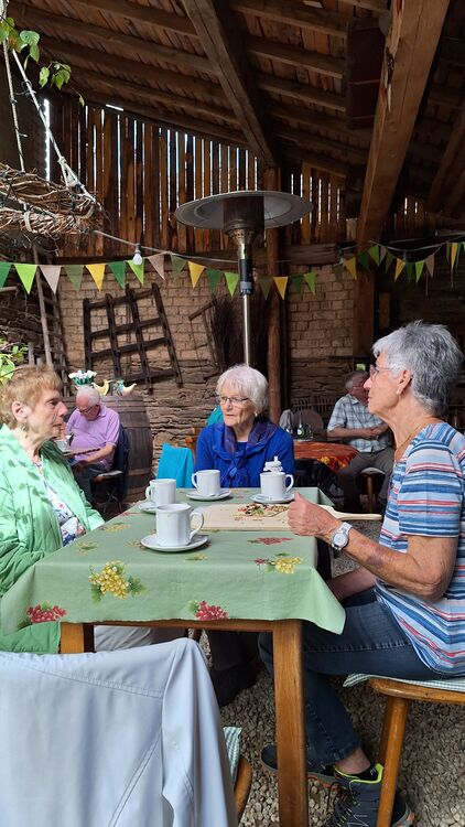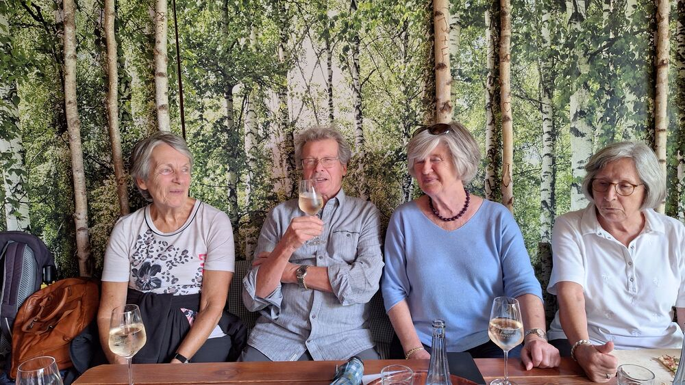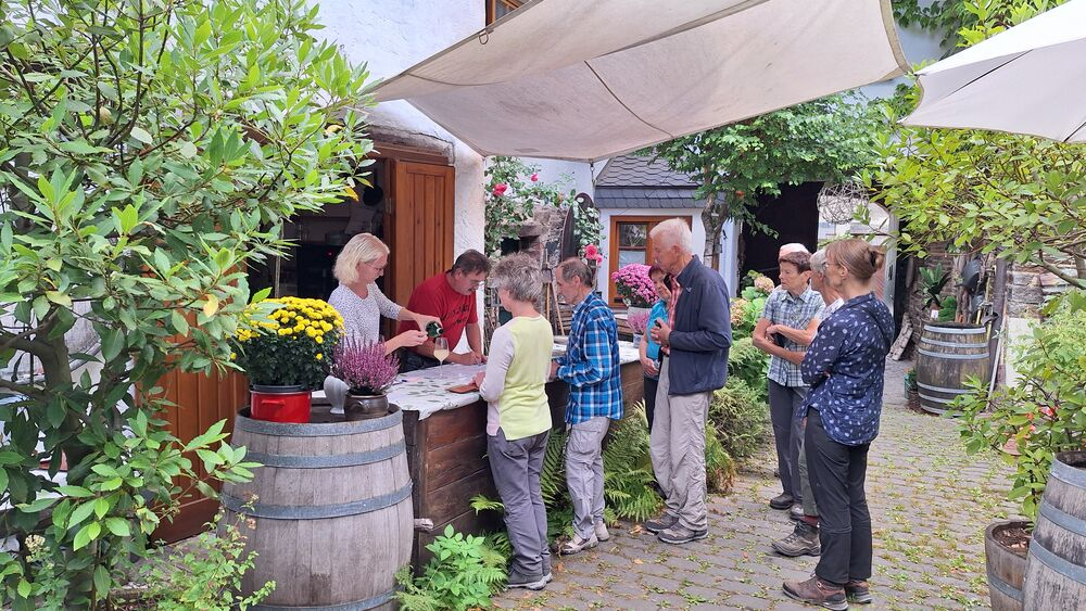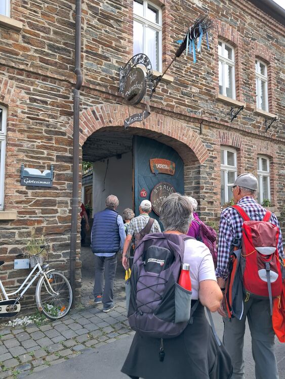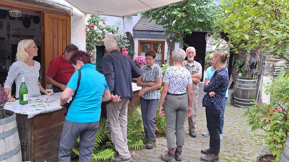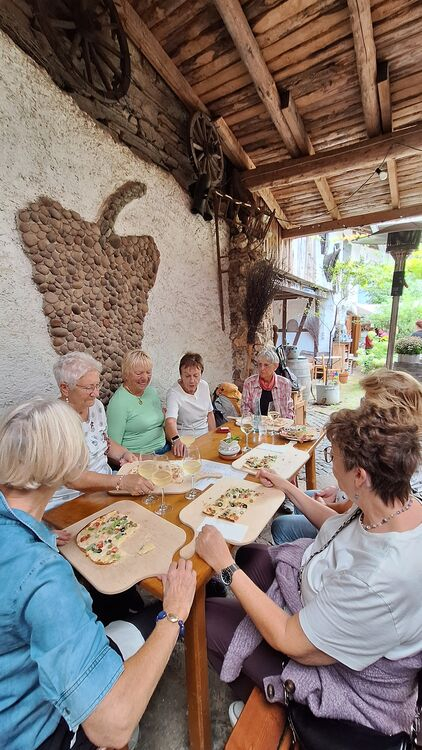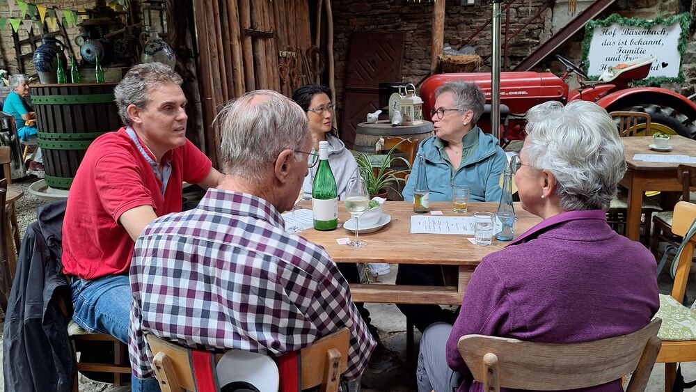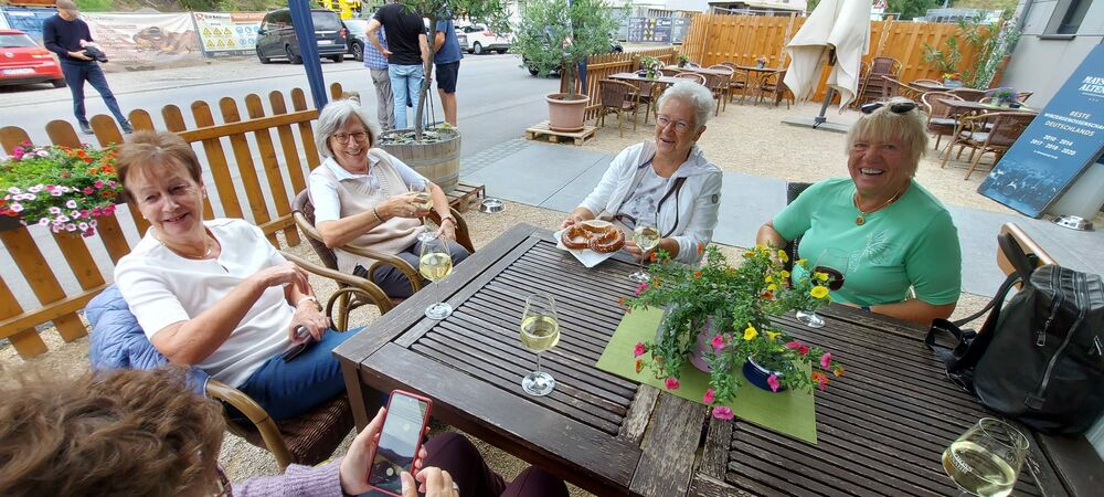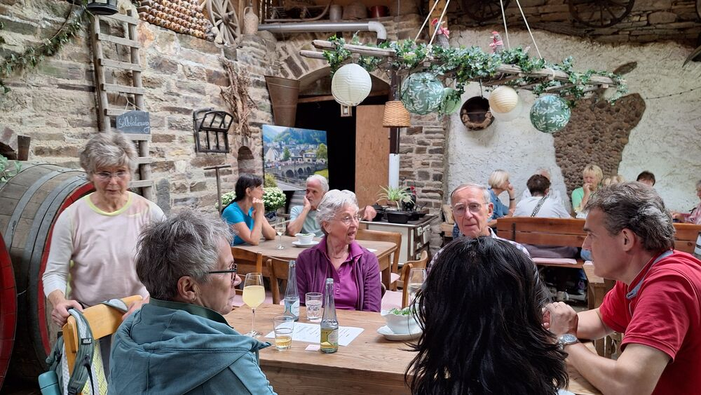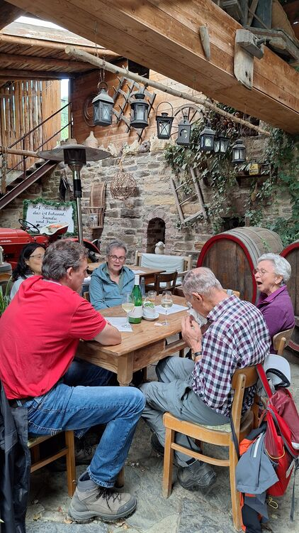 Alle Gruppen trafen sich zur gemeinsamen Einkehr im Bärenbachhof in Rech. Familie Schreier hatte extra für uns geöffnet und bewirtete uns wieder vorzüglich mit süffigem Wein und leckeren Winzertellern und Flammkuchen. Es wurde viel erzählt und gelacht bevor der Bus uns wohlbehalten zurück nach Bergheim brachte.