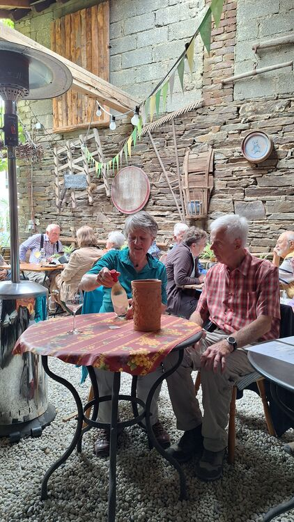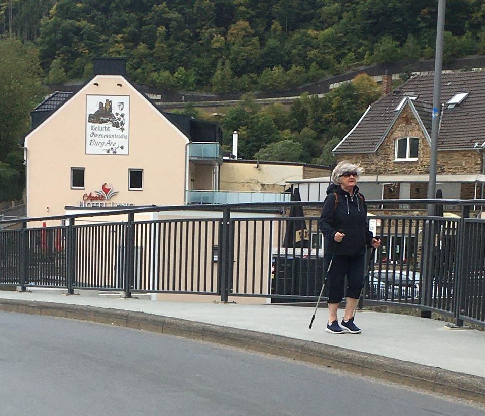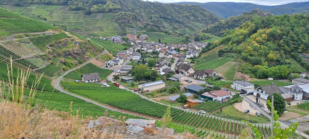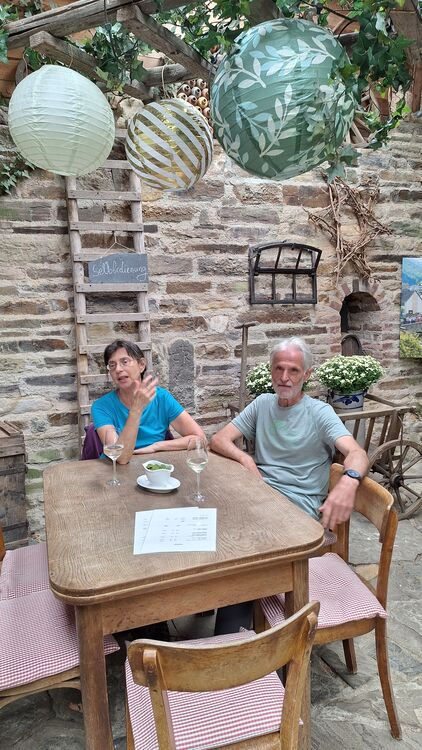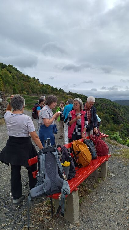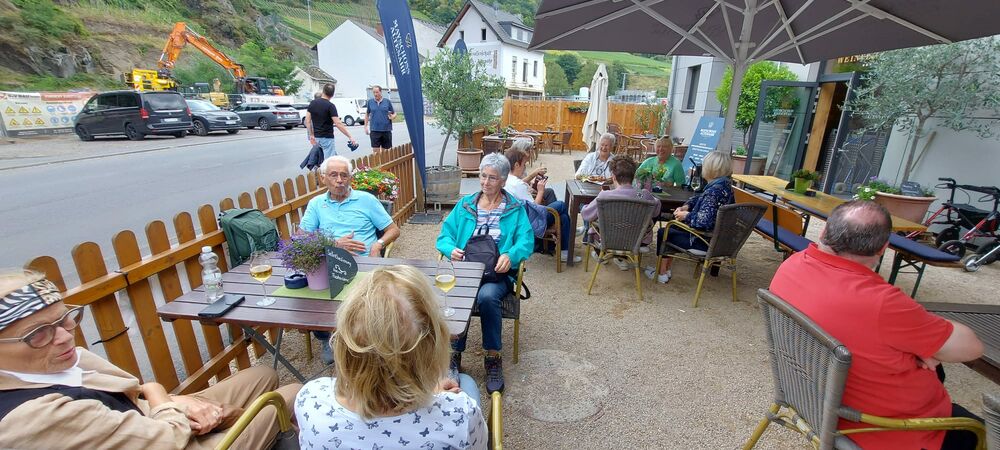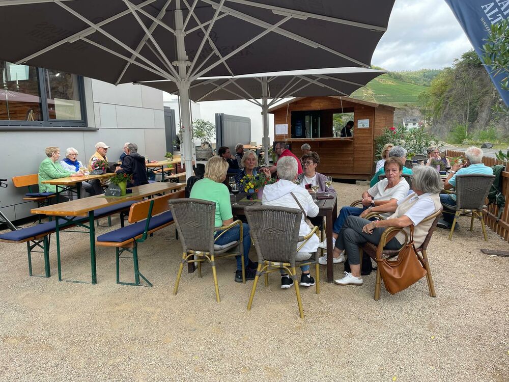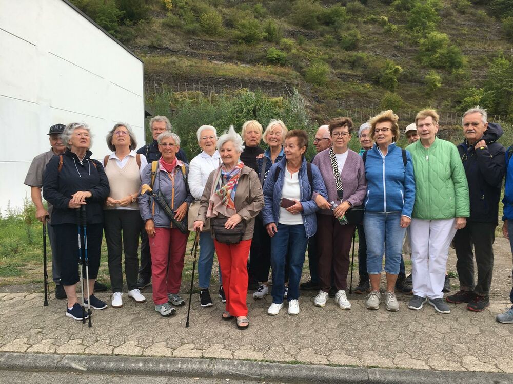 Gisela Herbst machte mit den Senioren einen Spaziergang durch Altenahr. Hier sah man noch deutlich die Folgen der Flutkatastrophe von 2021. Viele Gebäude waren noch nicht wieder aufgebaut, teils wurde fleissig gearbeitet und einiges erstrahlte schon in neuem Glanz. Mit dem Bus ging es weiter nach Mayschoss und nach einer Stärkung im Winzerkeller wanderte die Gruppe durch die Weinberge nach Rech.