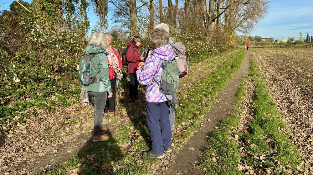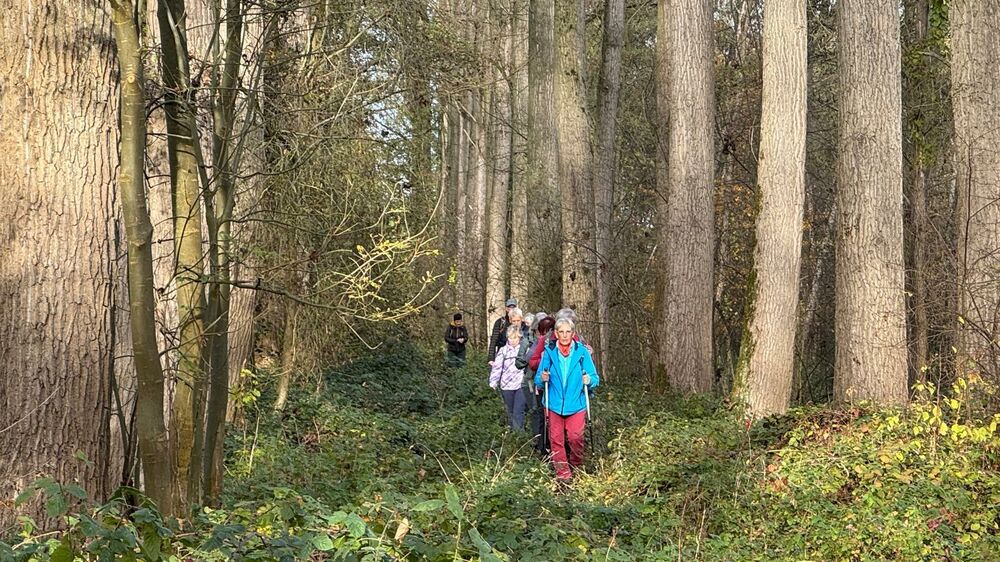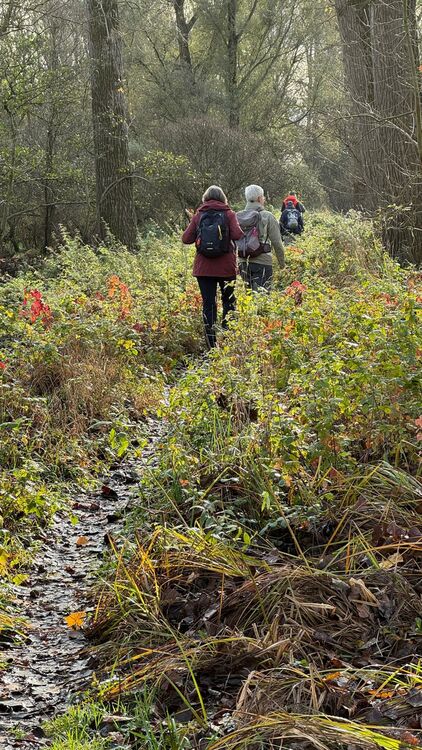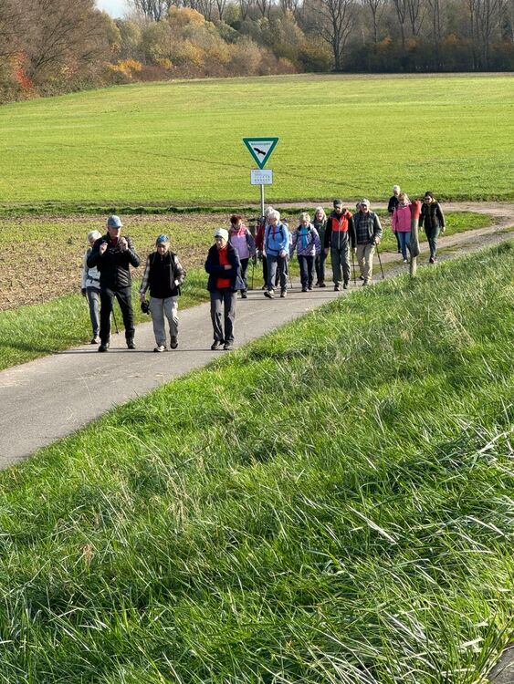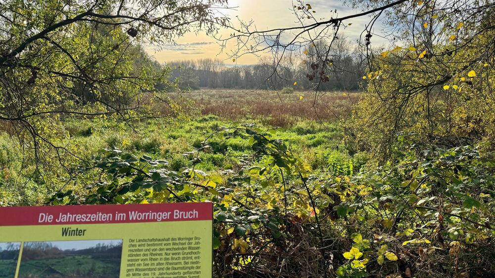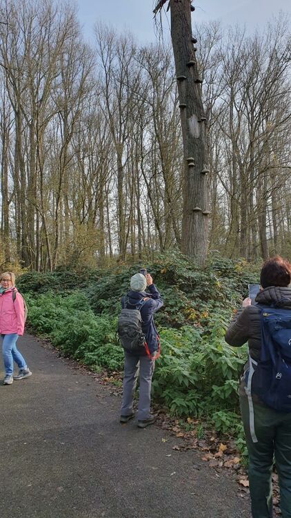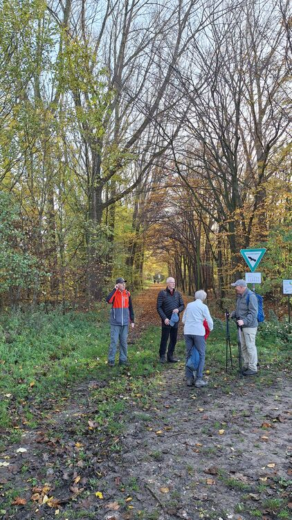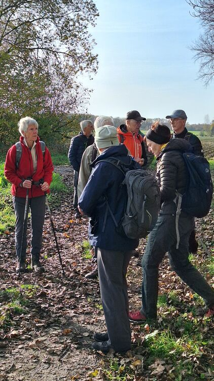 16 Wanderlustige zogen heute vom Worringer Bahnhof los, um mal wieder den Worringer Bruch zu erwandern. Die Bäume haben schon ziemlich viel Laub verloren aber mit der Sonne wurden die restlichen Blätter doch noch herbstlich bunt angestrahlt. Über Wald- und Wiesenpfade, schmal und auch breit durch den Bruch, bis wir am Rhein ankamen, leider waren die erhofften Glanrinder nicht mehr da, sind sicher schon im Stall, es gab nur noch einen Hinweis das sie da sind, im Frühling hoffentlich wieder gesund und munter zurück.