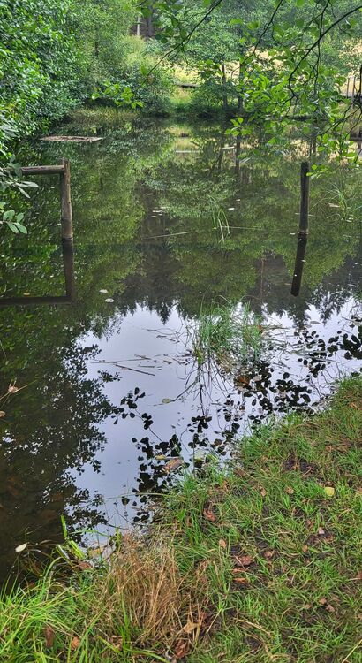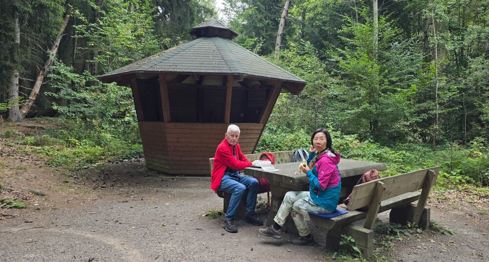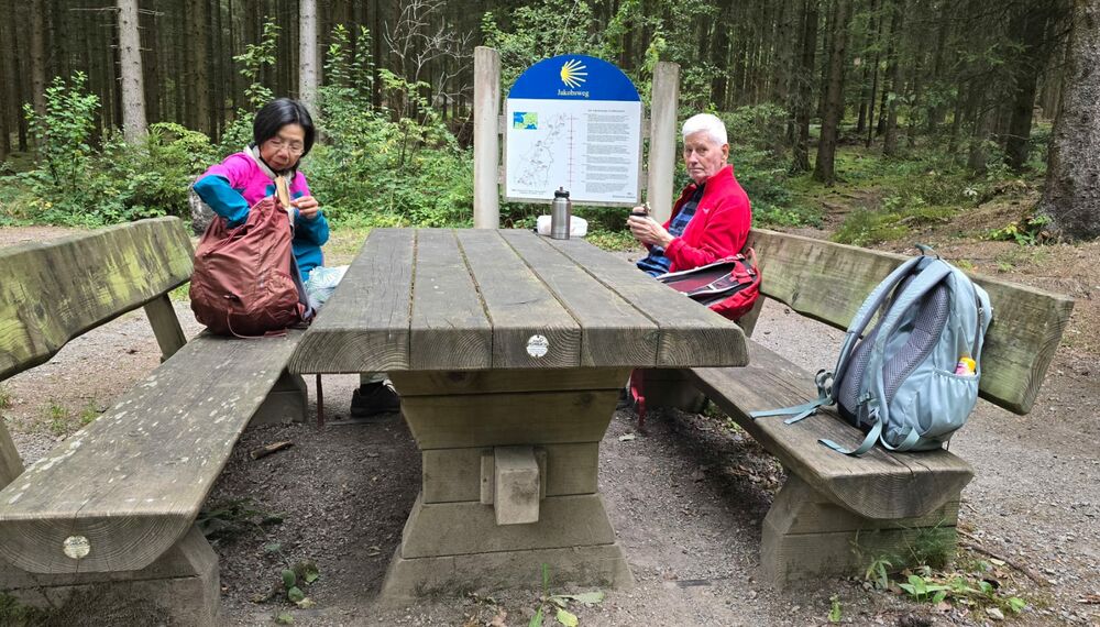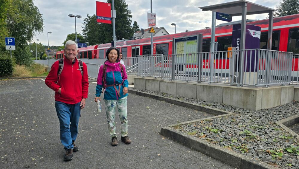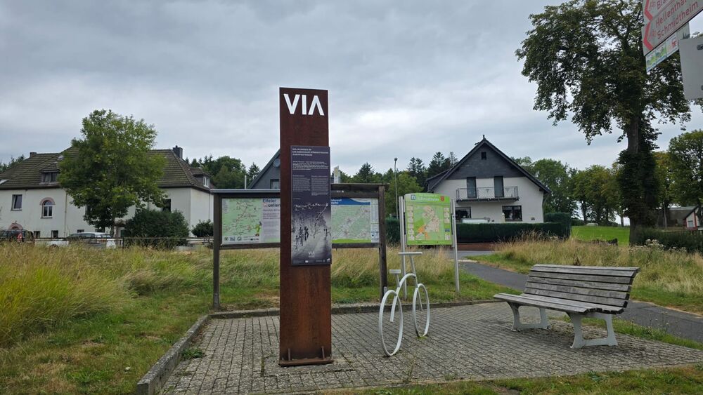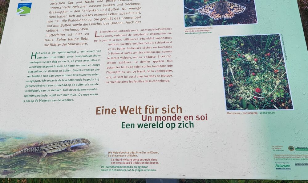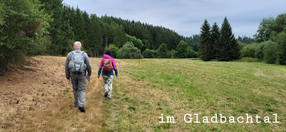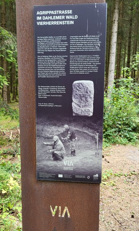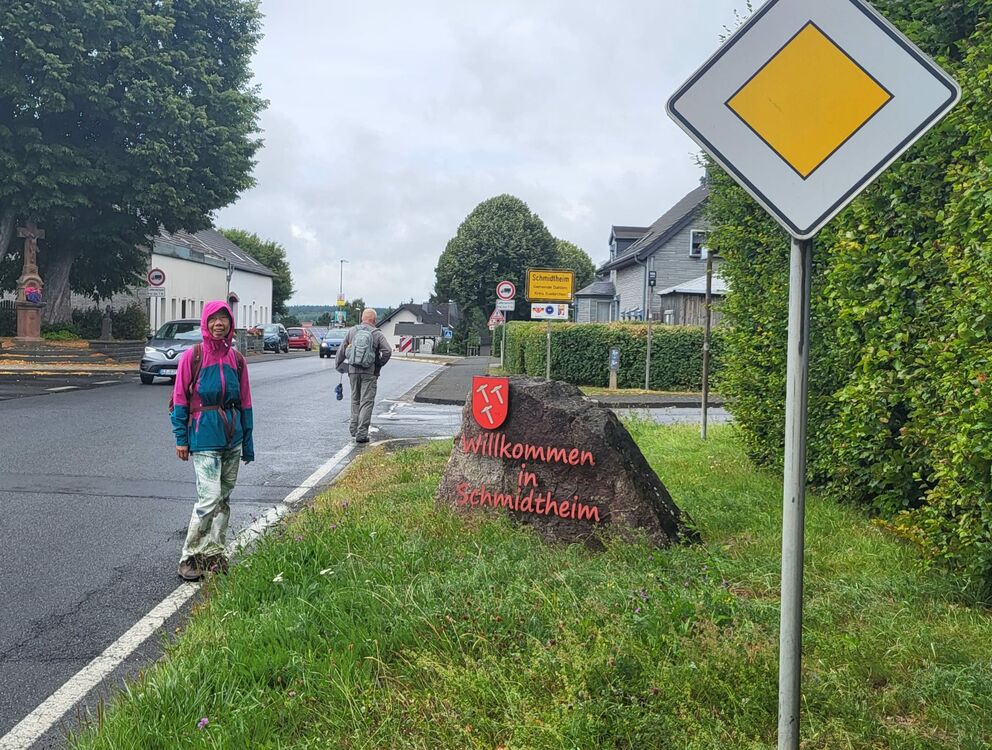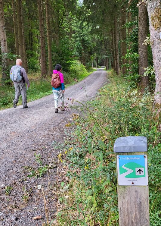 Unsere Wanderung zu Dritt auf dem Mühlen- und Moorpfad begann in Dahlem. Zunächst ging es durch das Glaadtbachtal und dann hinauf zum Rastplatz am Vierherrenstein an der Landesgrenze zu Rheinland-Pfalz. Dieser Stein zeigt die Gemarkungsgrenze von Esch, Schmidtheim, Dahlem und Jünkerath am Heidenkopf (547 m ü.NN) an. Weiter ins Heide- und Moorgebiet, das wir über Holzsteige durchwanderten. Unser Endziel war Schmidtheim, wo wir im Restaurant Bella Italia