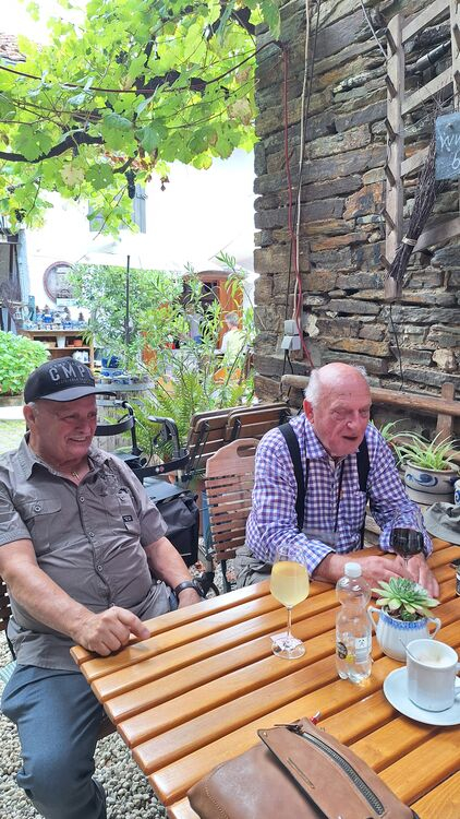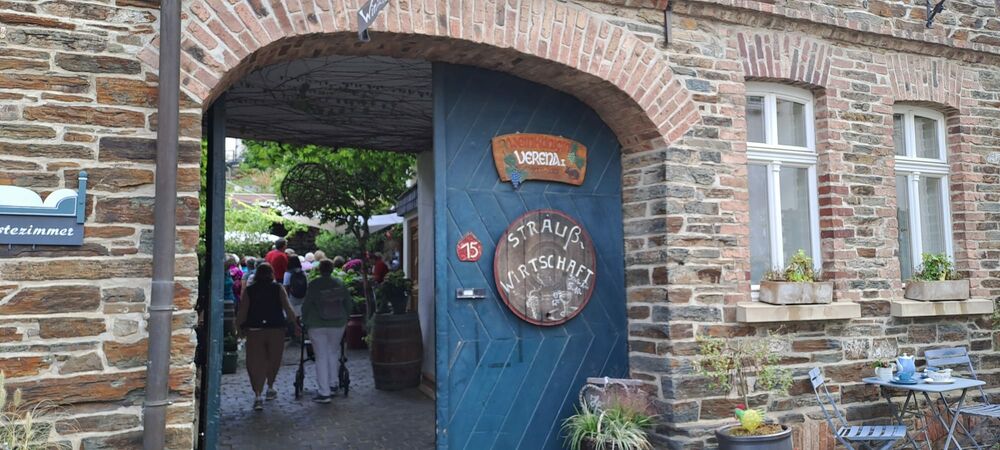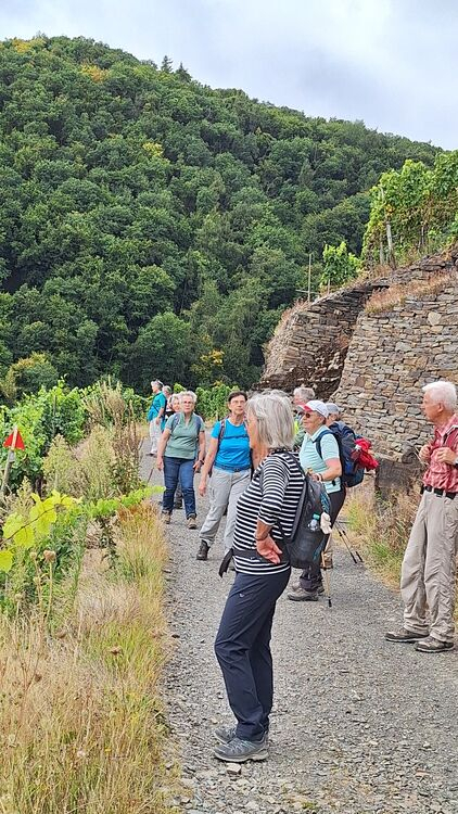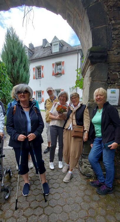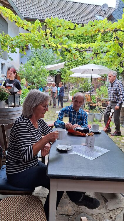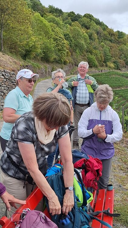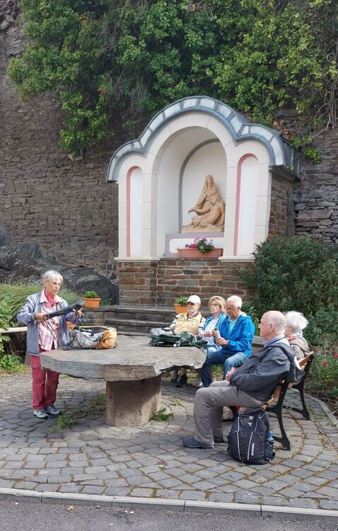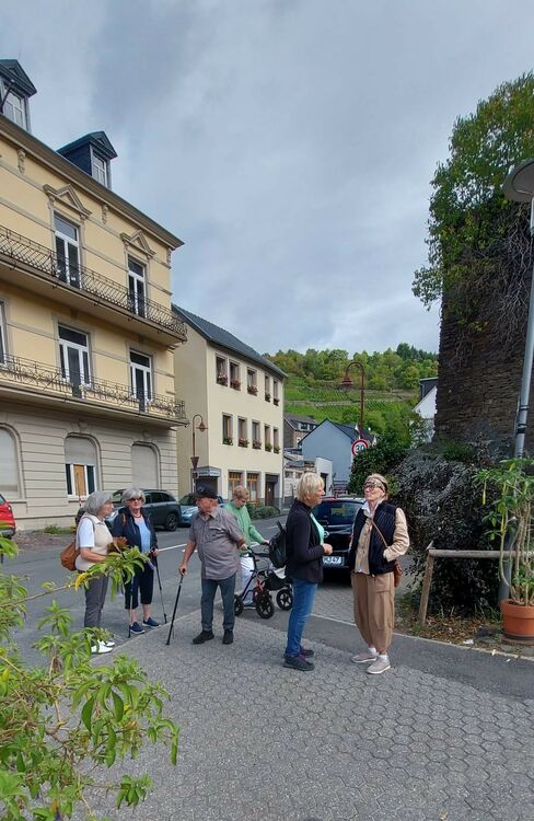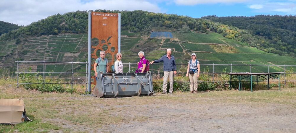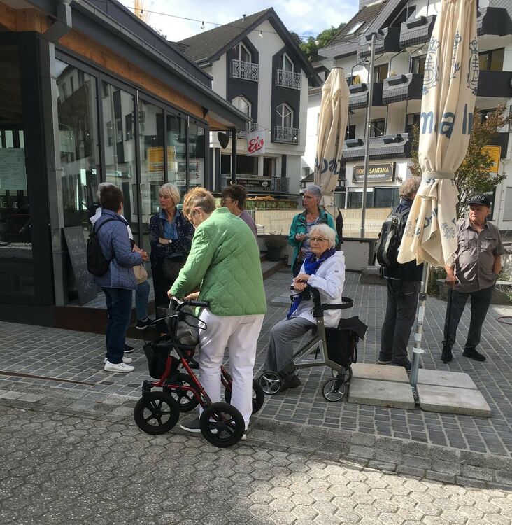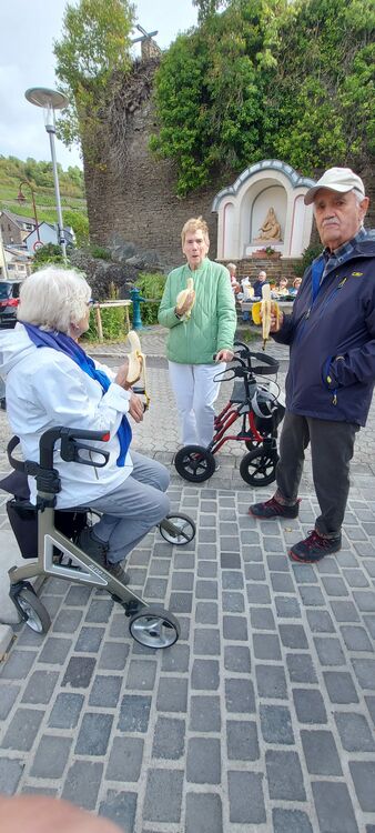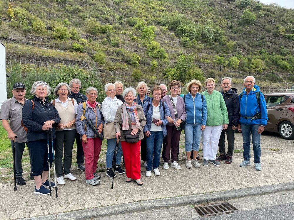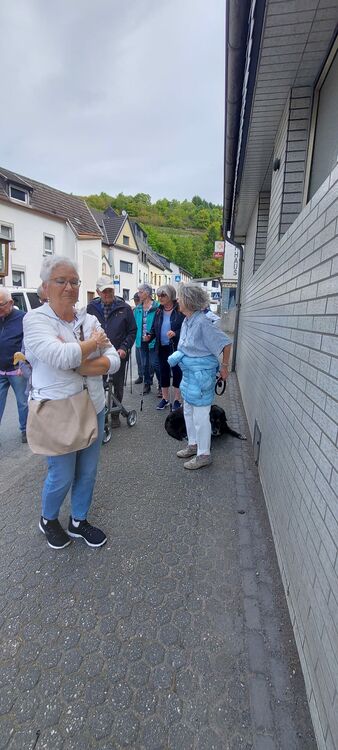 Gisela Herbst machte mit den Senioren einen Spaziergang durch Altenahr. Hier sah man noch deutlich die Folgen der Flutkatastrophe von 2021. Viele Gebäude waren noch nicht wieder aufgebaut, teils wurde fleissig gearbeitet und einiges erstrahlte schon in neuem Glanz. Mit dem Bus ging es weiter nach Mayschoss und nach einer Stärkung im Winzerkeller wanderte die Gruppe durch die Weinberge nach Rech.