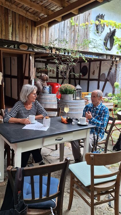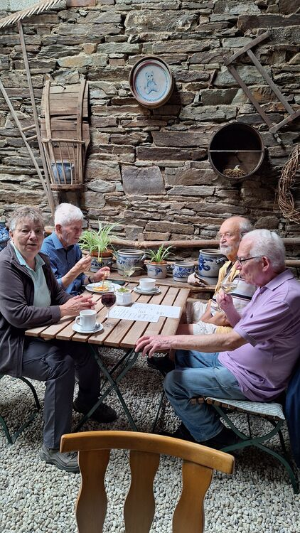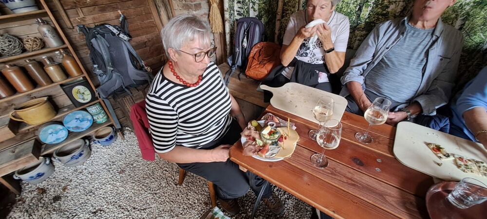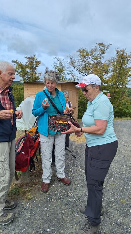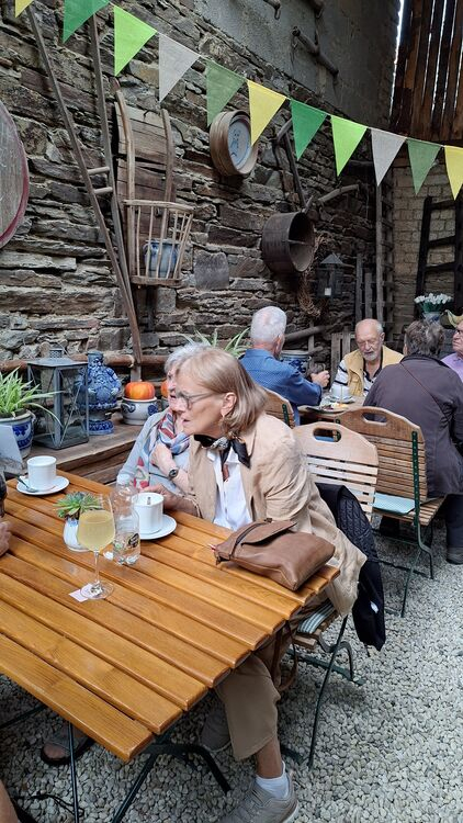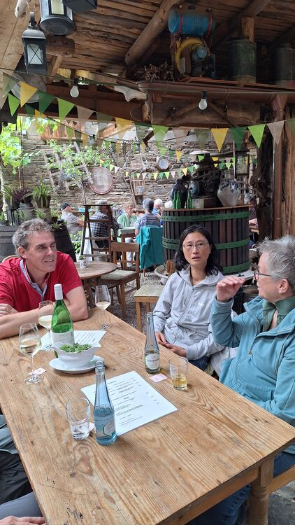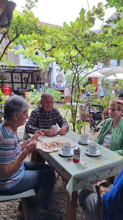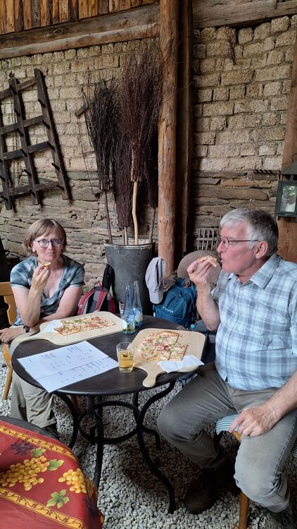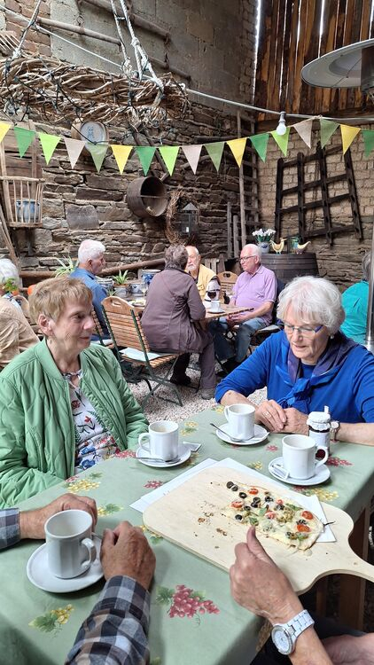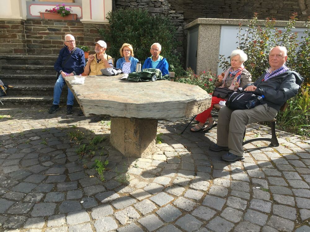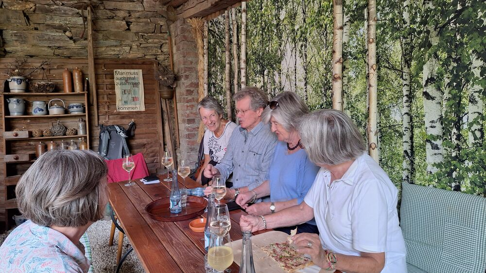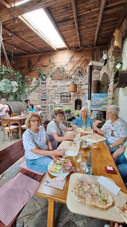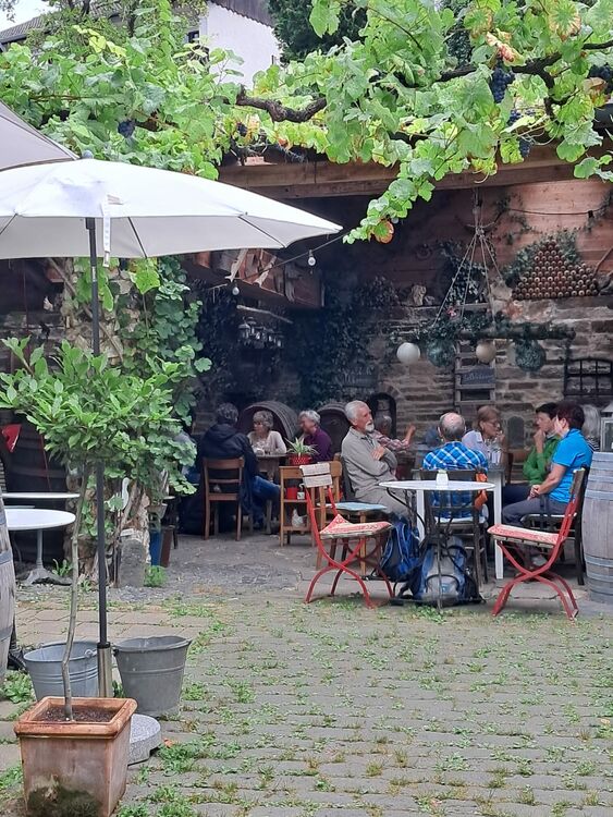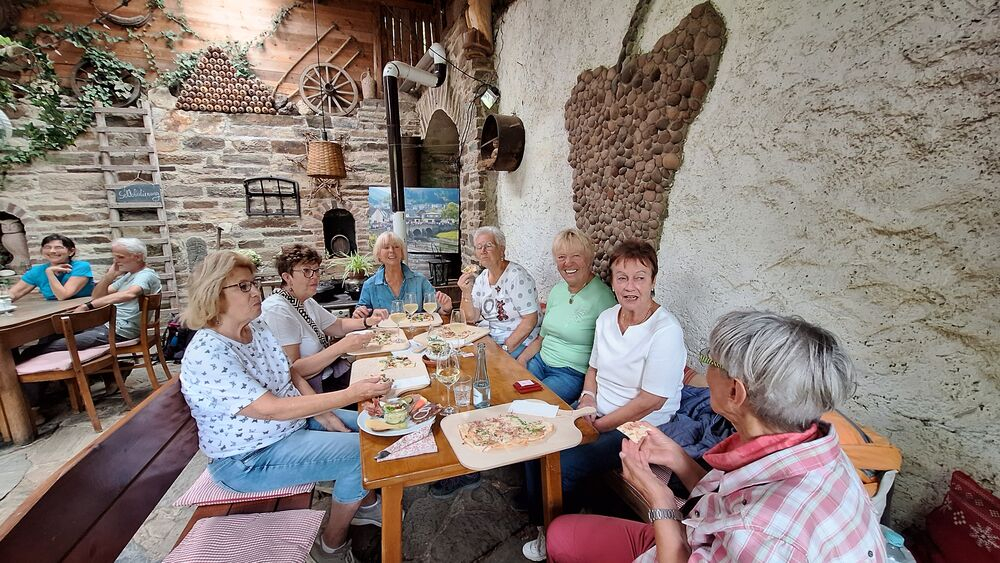 Alle Gruppen trafen sich zur gemeinsamen Einkehr im Bärenbachhof in Rech. Familie Schreier hatte extra für uns geöffnet und bewirtete uns wieder vorzüglich mit süffigem Wein und leckeren Winzertellern und Flammkuchen. Es wurde viel erzählt und gelacht bevor der Bus uns wohlbehalten zurück nach Bergheim brachte.