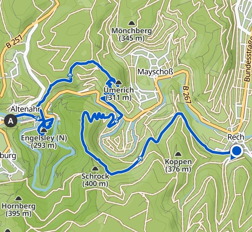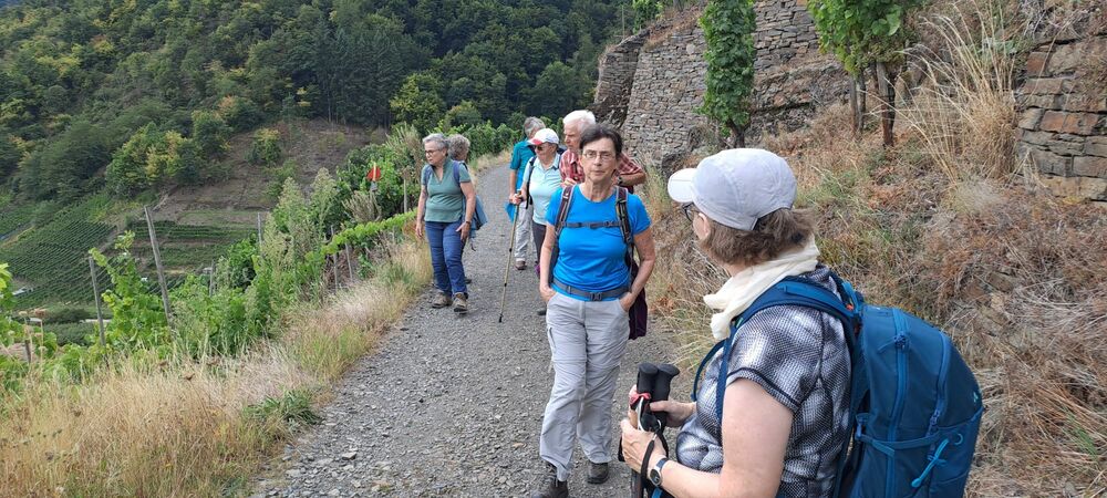 Die Mittelstreckengruppe startete in Altenahr auf dem Rotweinwanderweg nach Mayschoss, mit vielen herrlichen Ausblicken in die Weinberge. Am Michaelishof ging es runter nach Mayschoss und durch die Weinberge und einen Abstecher auf die Saffenburg weiter nach Rech.