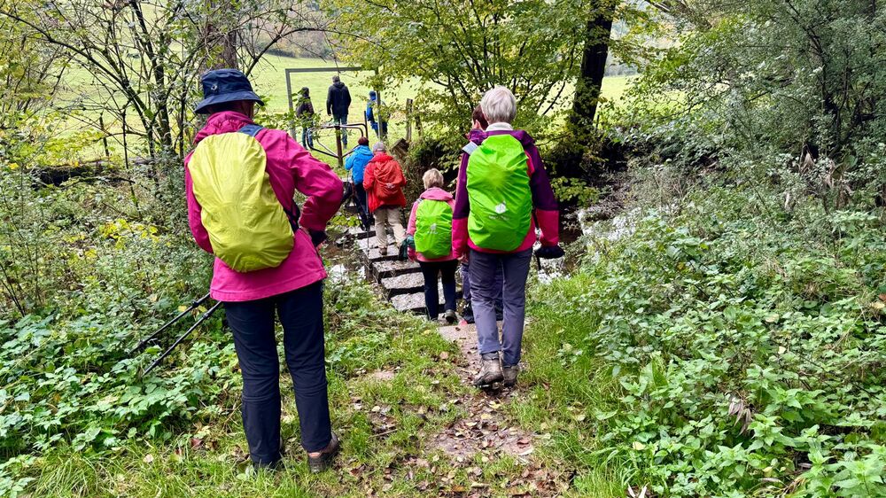 Im Iterbachtal überqueren wir auf grossen Trittsteinen ganz bequem den Iterbach, hier unten sind die Wiesen schon sehr nass, sogar Trittsteine über ein Wiesenstück, immer wieder rauf und runter über die Kuhweiden. An anderer Stelle sollte es wieder auf Trittsteinen über den Bach gehen, leider stand das Wasser hier so hoch, es ging nicht.