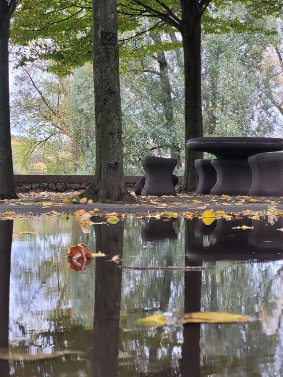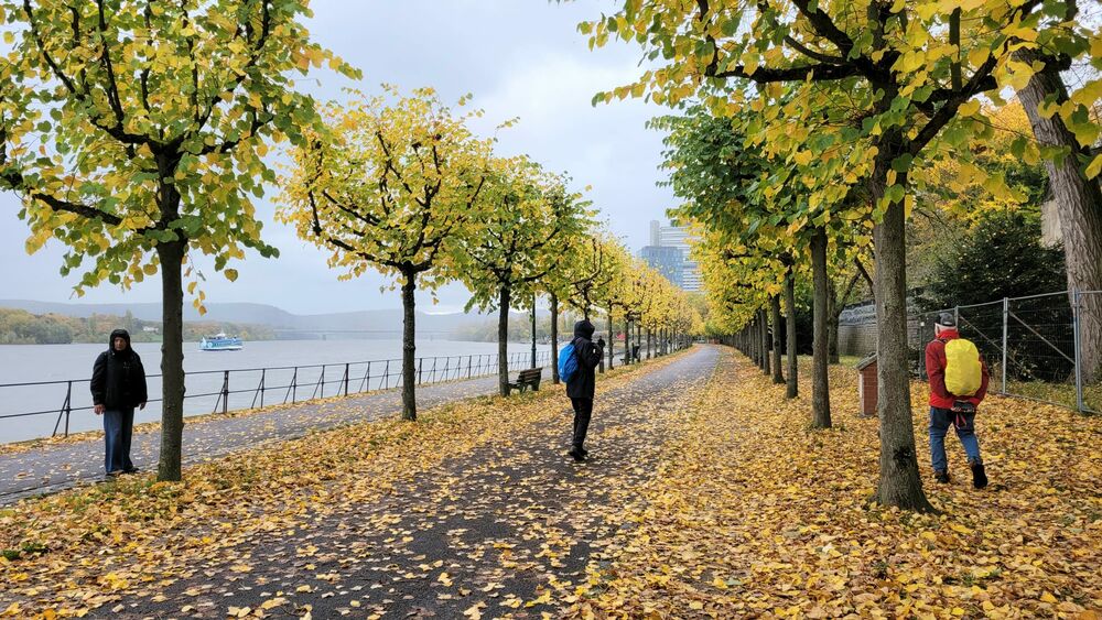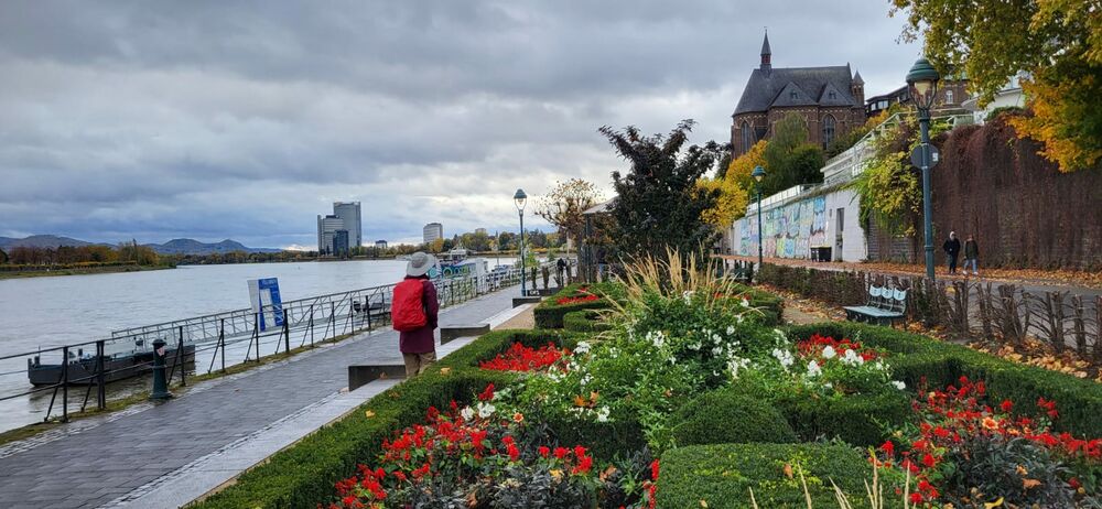 Hier grauer Blick zum Siebengebirge und weiter auf der Promenade am Rhein entlang zur Rheinaue mit Mittagspause.