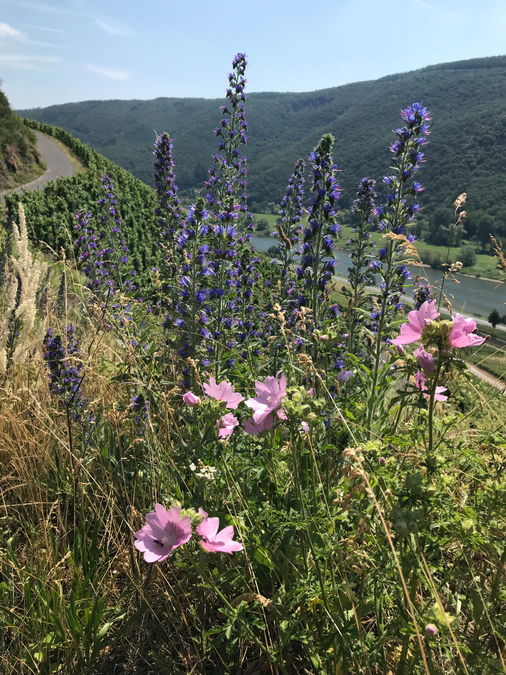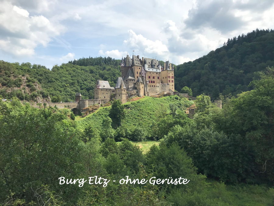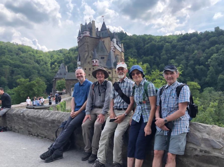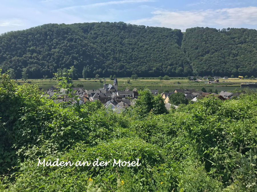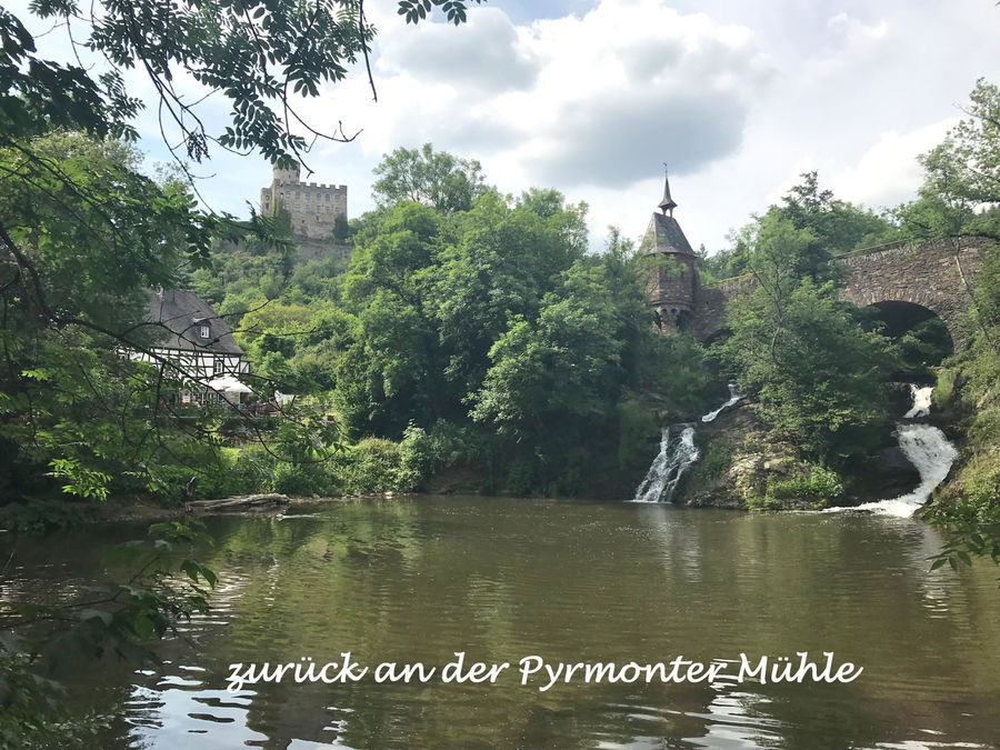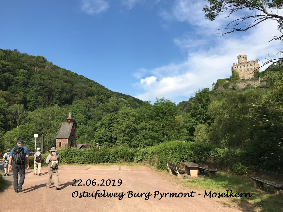 Erst ging es hoch zur Burg Pyrmont, die heute für Privatleute leider gesperrt war - hier war eine Hochzeit, - also konnten wir nur durch ein kleines Türchen auf den Innenhof schauen. Wieder den Berg hinunter, über viele Feld- und Wiesenwege mit vielen Aussichten ging unser Weg dann dem Moseltal entgegen, über den Müdener Berg, dann ein Stück Moselsteig, durch die Weinberge immer im auf und ab, bis wir dann Moselkern erreichten, hier gab es dann ein Kaltgetränk oder wer mochte auch einen Kaffee im "kleinen Kaffee", von hier sind wir dann durch das verwunschene und kühle Elzbachtal hoch zur Burg Eltz, diesmal war die Burg ohne Gerüste zu sehen - wunderschön! Auf schönen schmalen Pfaden immer weiter im auf und ab bis dann schließlich unser heutiges Ziel - die "Pyrmonter Mühle" erreicht war. Wieder ein gelungene Wanderung und hier gab es zum Abschluss den wohlverdienten Kuchen zum Kaffee.